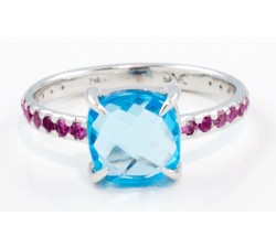 Anello in oro bianco 18Kt Topazio azzurro taglio cuscino da Cm.0,9x0,9 Zaffiri rosa taglio brillante per Ct.0,45 Dimensione gambo mm.2,3 Incluso...