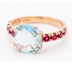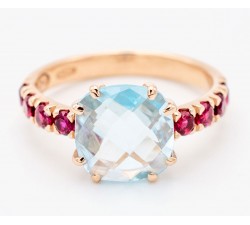 Anello in oro rosa 18Kt Topazio azzurro taglio cuscino Rubini taglio brillante per Ct. 0,65 Incluso con l’acquisto Scatola Dienneci Gioielli...