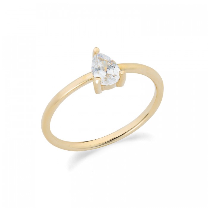 Un anello elegante e sofisticato, realizzato in oro giallo 375‰ con un design essenziale che mette in risalto la brillantezza dello zircone bianco taglio a goccia. La pietra, incastonata a tre griffe, cattura la luce con delicatezza, donando un tocco di raffinatezza e femminilità. Perfetto da indossare da solo per un look minimalista o abbinato ad altri anelli per creare combinazioni uniche.