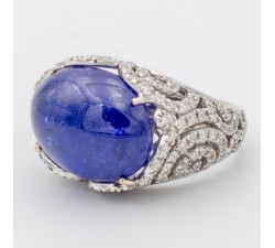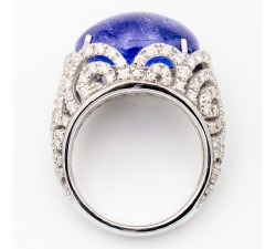 Anello in oro bianco 18Kt Tanzanite naturale taglio cabochon da Ct. 14,74 Diamanti naturali taglio brillante Ct. 1,06 colore G/H purezza Vs/si...